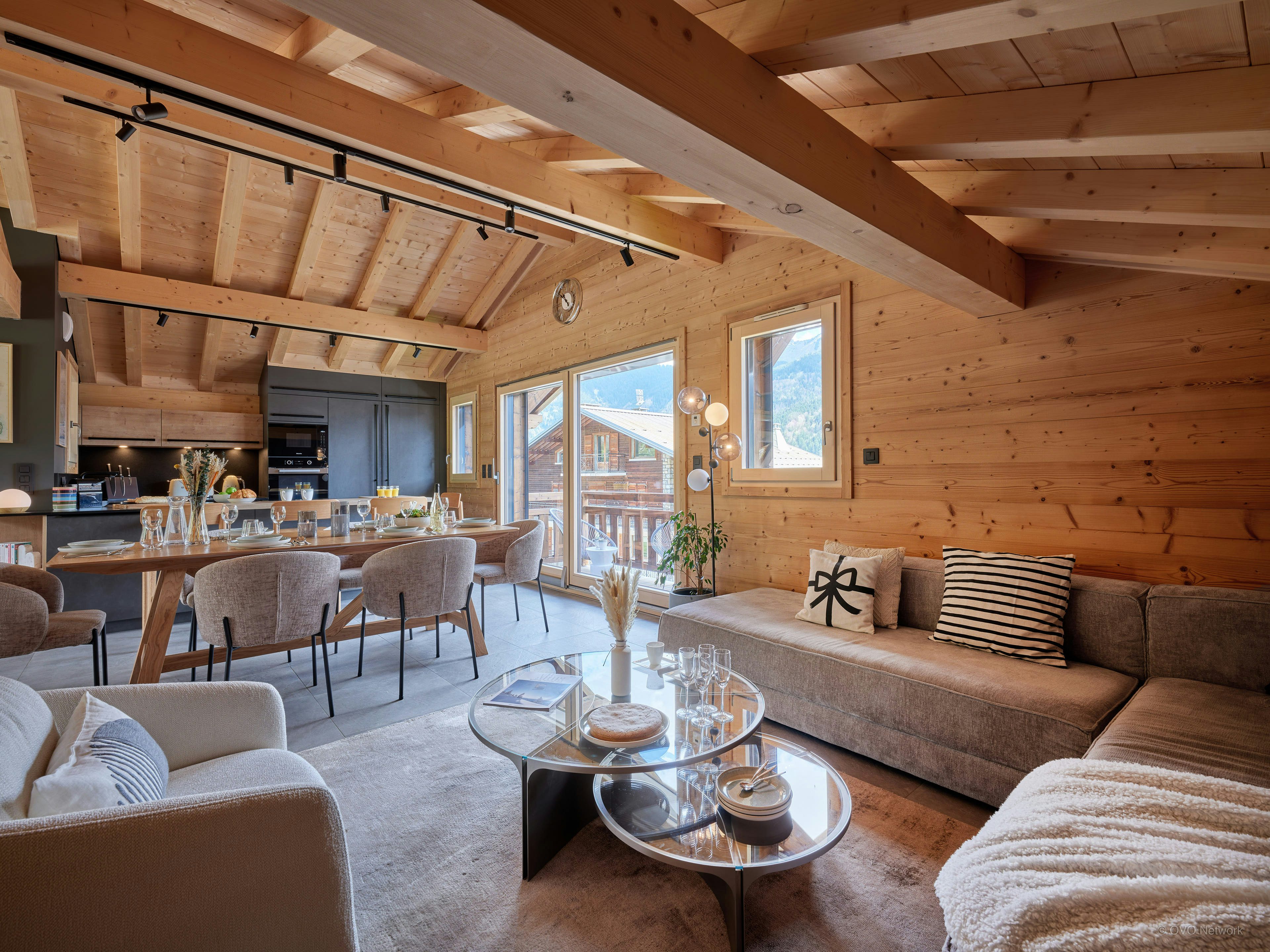 The living room on the upper floor has a beautiful exposed roof frame. Large windows mean it gets plenty of light and enjoys splendid views of the mountains and the resort of Avoriaz.
